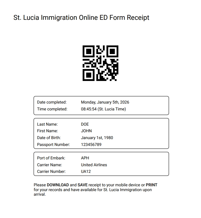 All travelers must complete the Travelers are strongly advised to complete the St Lucia ED form prior to arrival. Each individual traveler, including minors, must submit a separate form. After submission, travelers receive a confirmation with a QR code, which may be requested by airline staff or Saint Lucian immigration and customs officials upon arrival. The QR code can be presented digitally or as a printed copy.